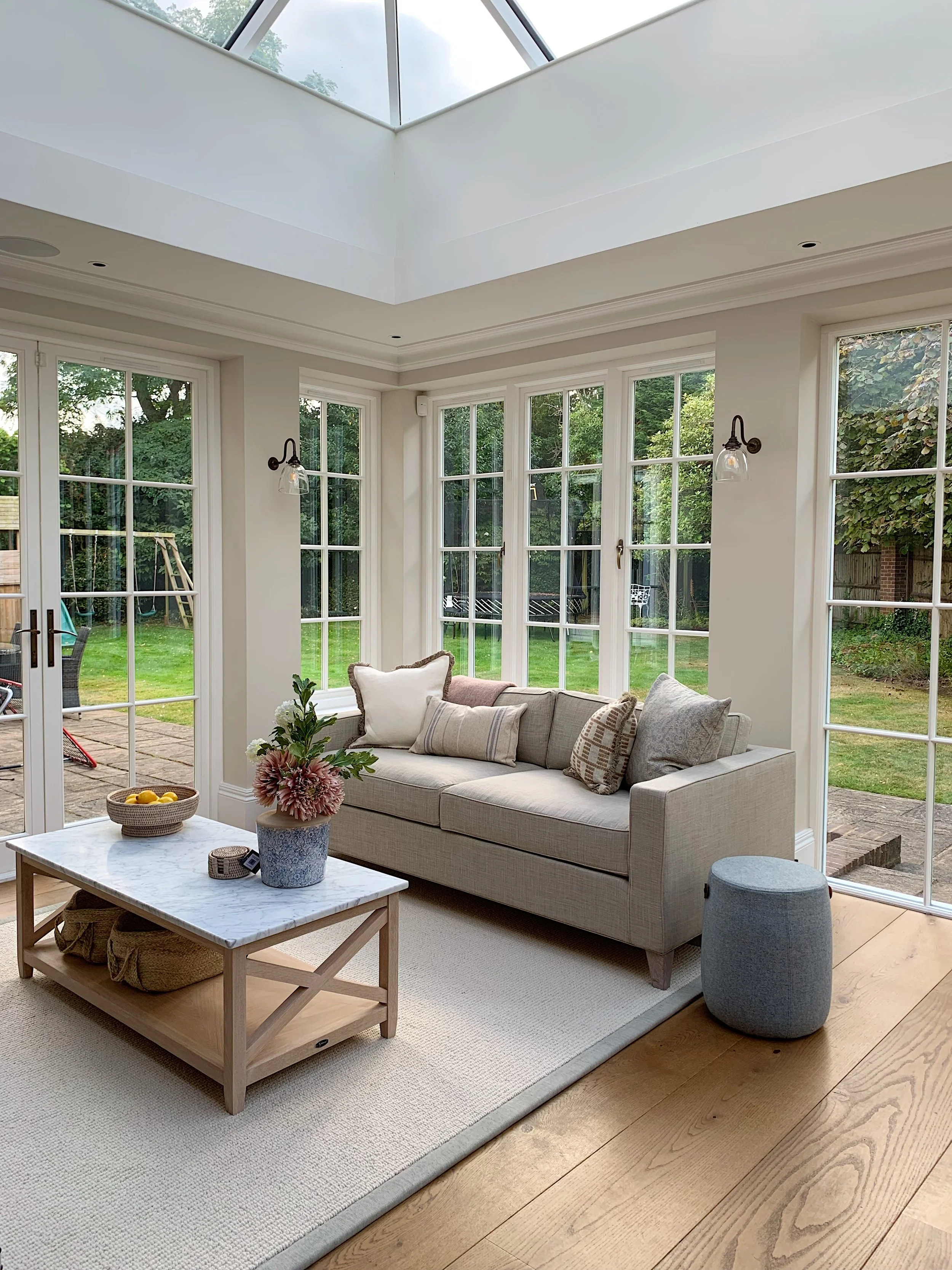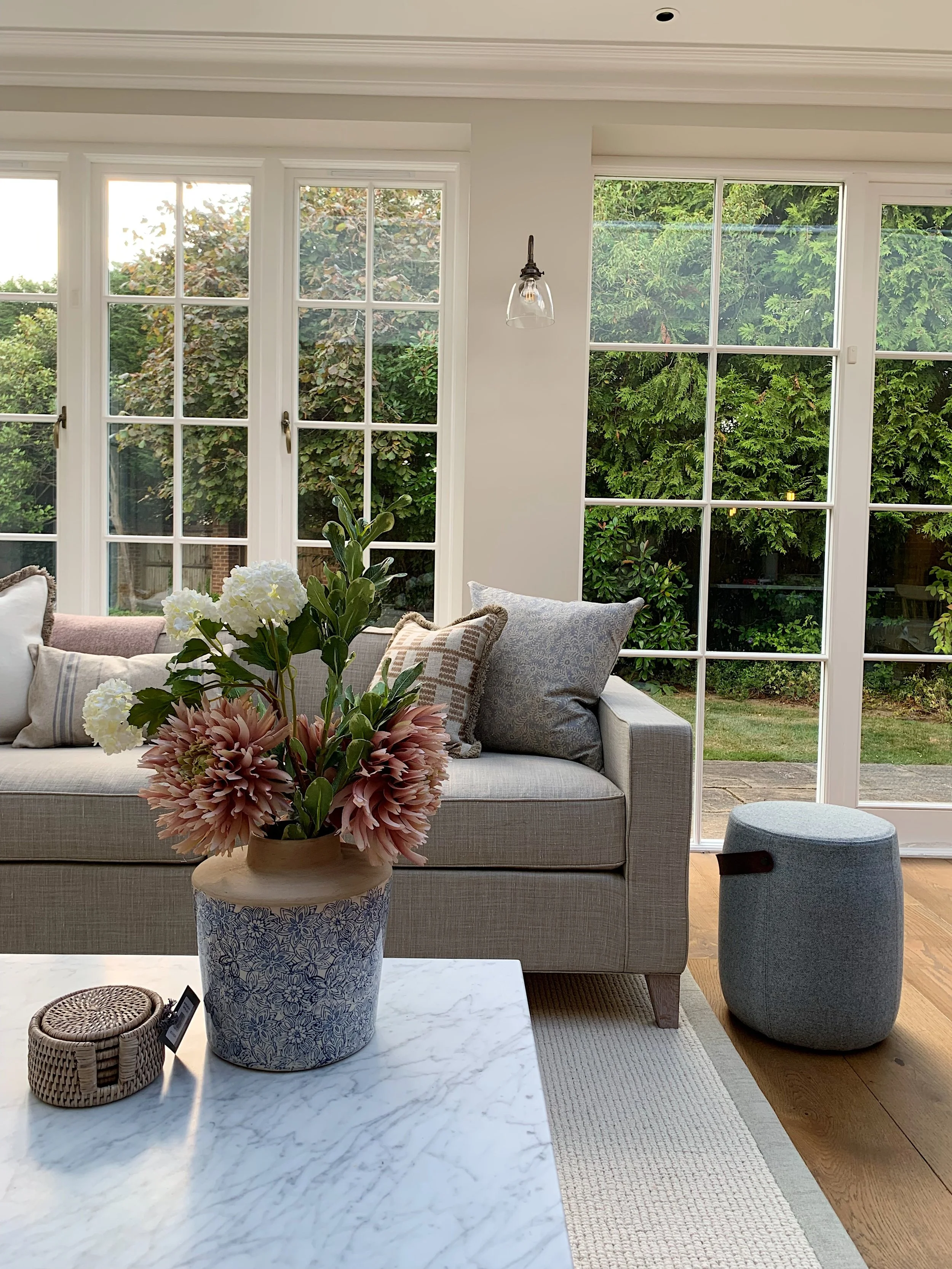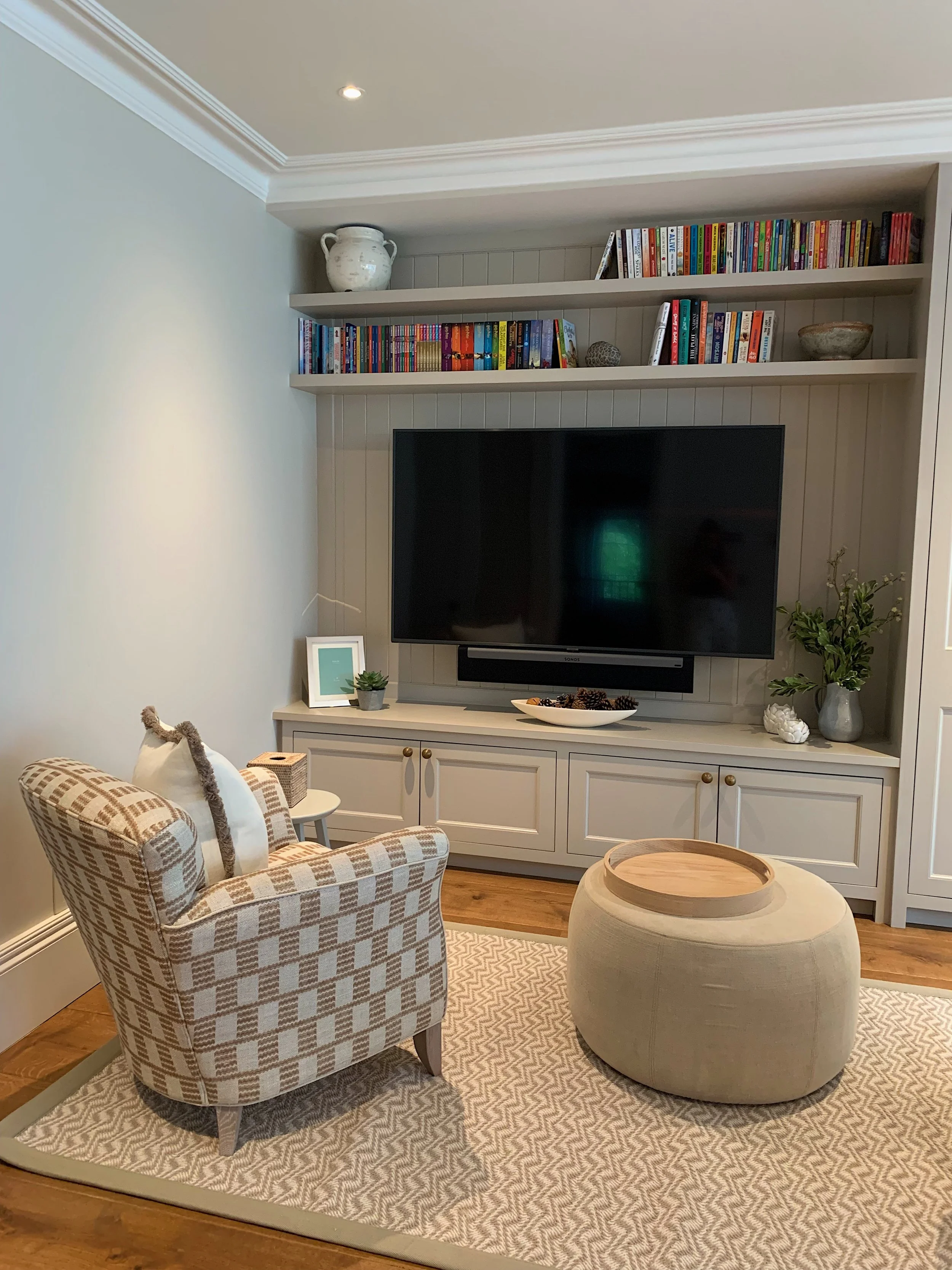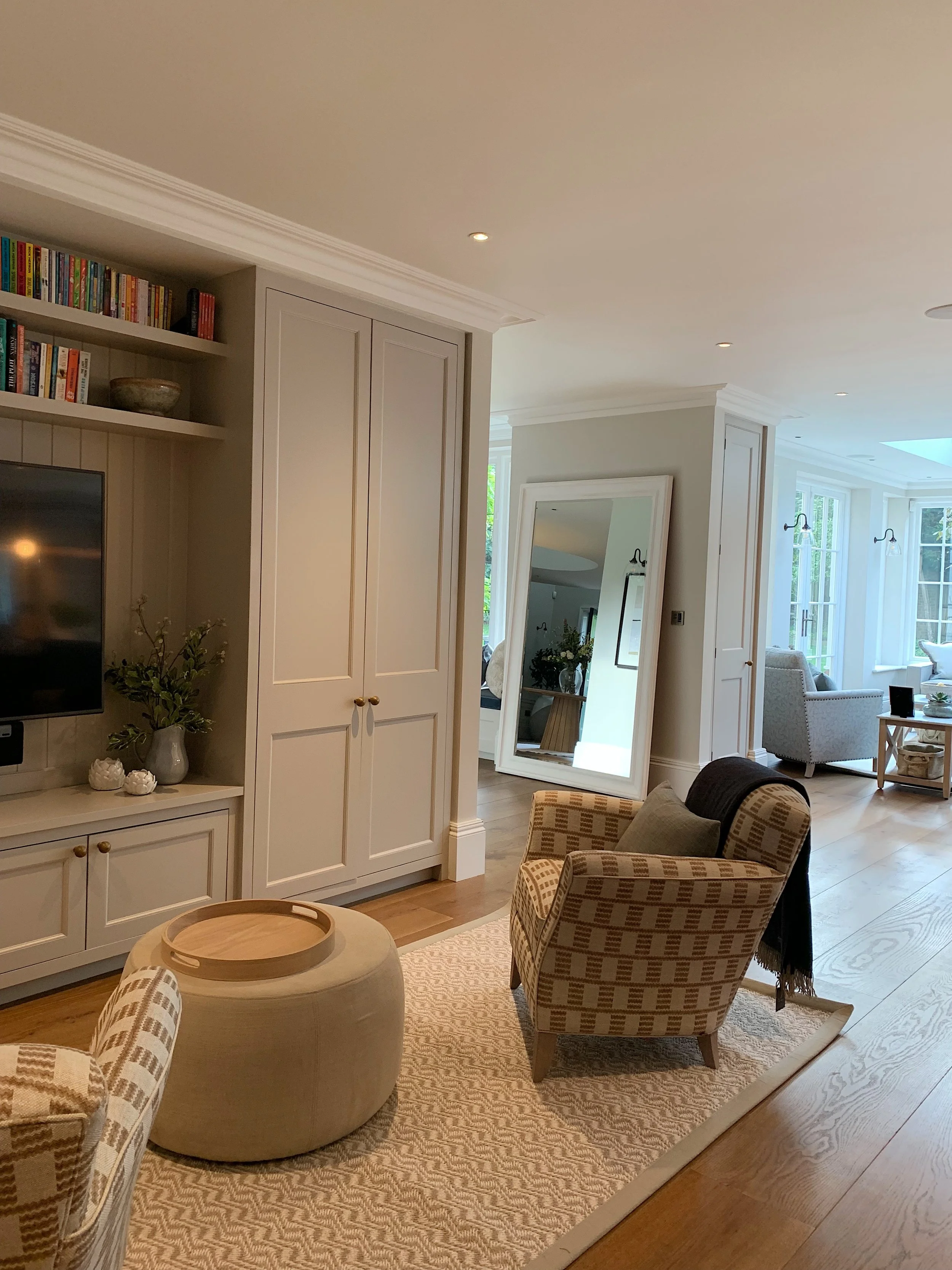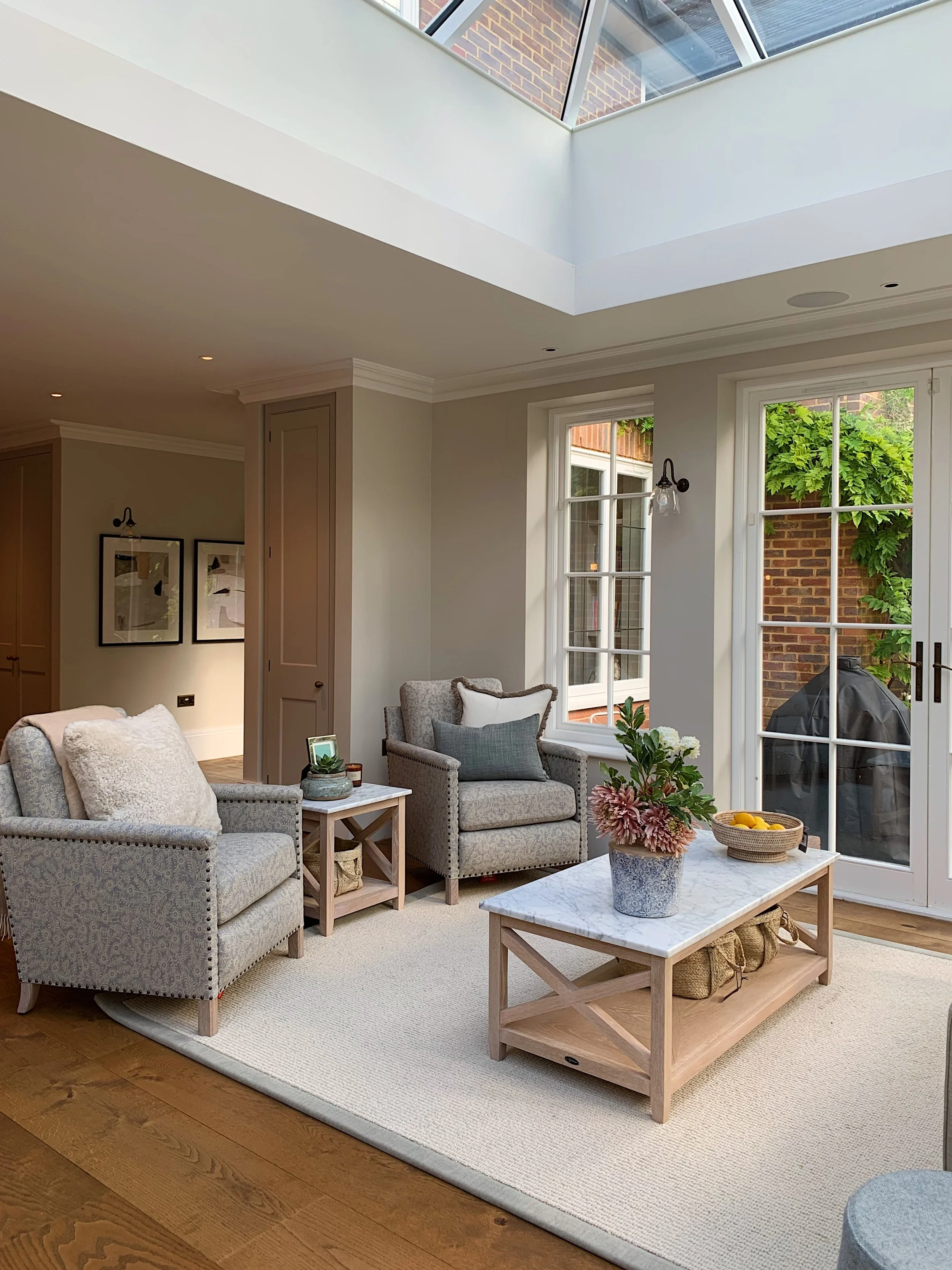 For Phase 02 of the project, we focused on bringing character and function to the remaining key spaces of the home. The grand hallway was designed to make a lasting first impression, centred around a beautiful spiral staircase. We incorporated discreet storage solutions and plenty of comfortable seating, ensuring the space feels both elegant and practical for everyday family life. Next, we created a cosy TV snug adjacent to the open-plan kitchen, a favourite spot for the children to unwind after school. This space features fun yet subtle patterns that feel playful while remaining in harmony with the home’s soft, neutral palette. Finally, the coffee area was designed as a bright and uplifting space, enhanced by skylights above. A neutral sofa anchors the room, complemented by two patterned armchairs in soft blue tones that tie in beautifully with the navy kitchen, completing a cohesive and inviting home.