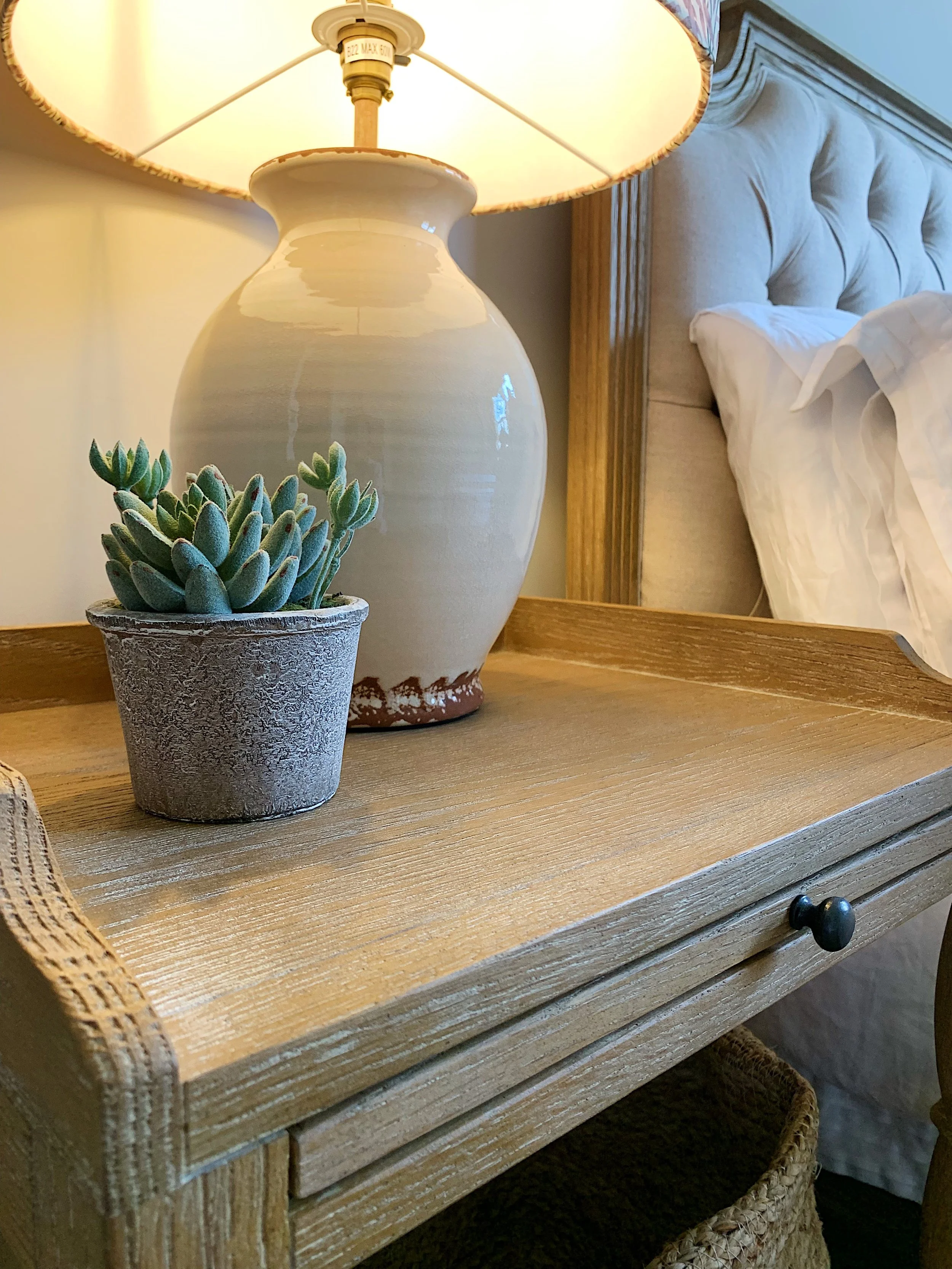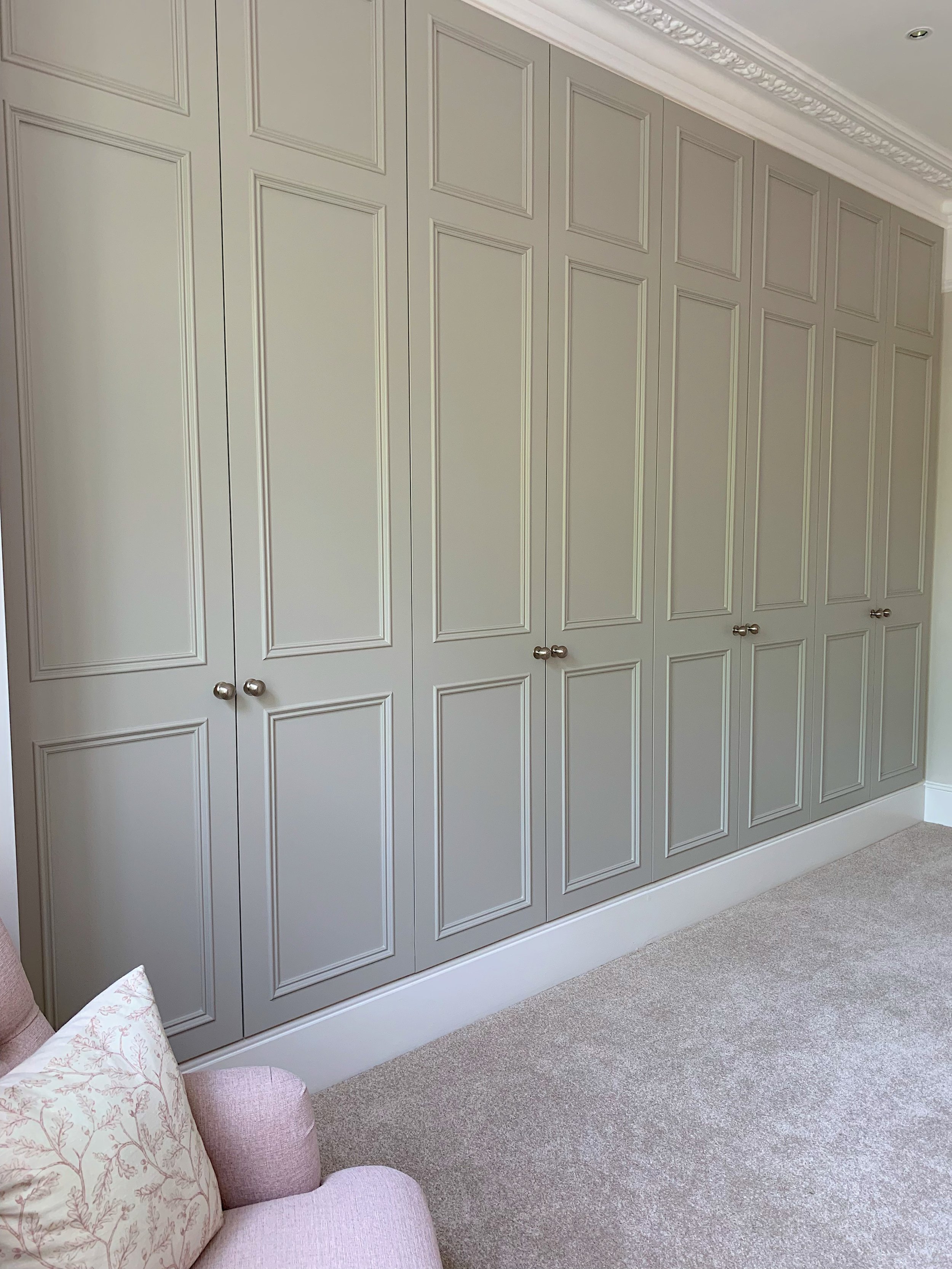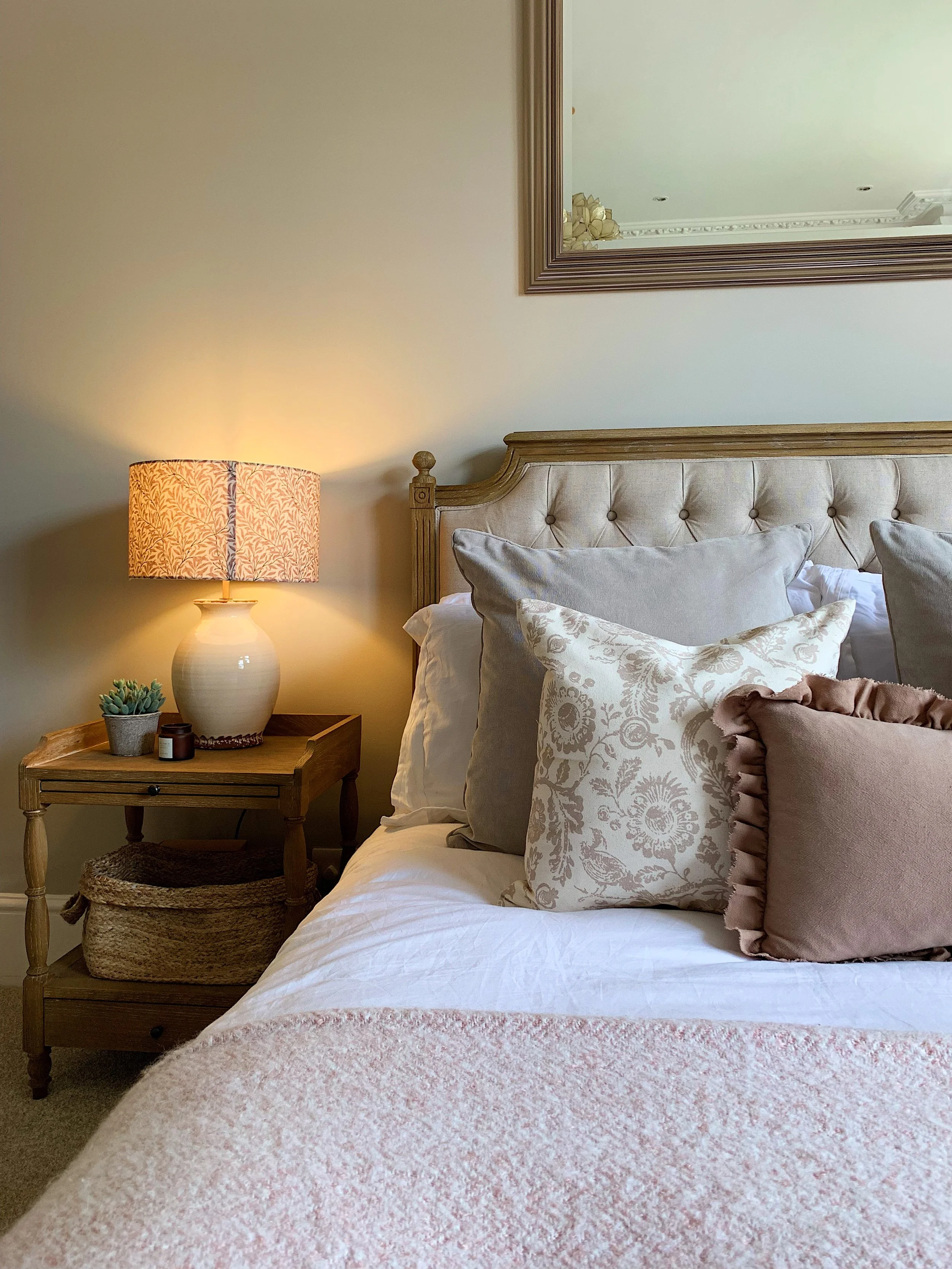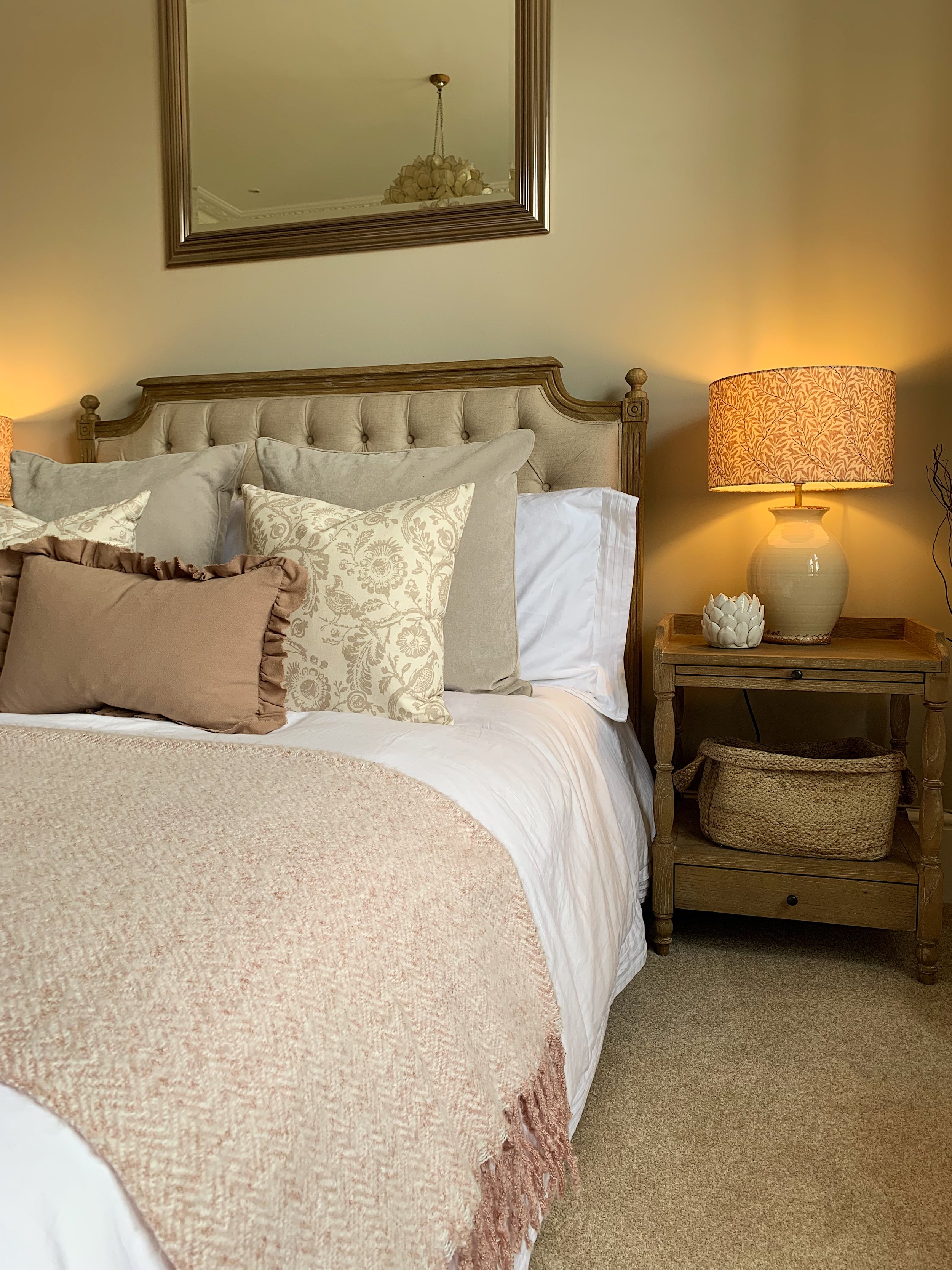 This guest bedroom has been thoughtfully redesigned to create a calm and welcoming retreat. The palette of soft, neutral tones provides a soothing backdrop, enhanced by the texture of the new carpet underfoot. Custom designed joinery adds elegance and functionality, with detailed panels to reflect the properties heritage. All furniture pieces are newly sourced, blending subtle wood elements for warmth and character. The window treatment includes bespoke curtains and a tailored pelmet, framing the view beautifully while adding a touch of sophistication. Walls are painted in a serene tone, contributing to the overall tranquil and inviting atmosphere. A key part of the design was incorporating the client’s sentimental rocking chair, which we carefully worked into the layout as a meaningful feature.